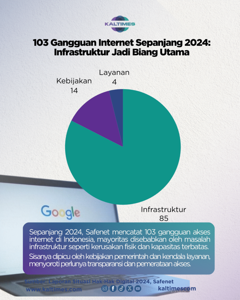 Sementara itu, sekitar 14  persen disebabkan oleh kebijakan pemerintah, seperti pemblokiran atau sensor konten. Sisanya, yakni 4  persen, diakibatkan oleh kendala layanan seperti biaya dan inklusivitas provider. Data ini menempatkan fokus utama pada akar permasalahan infrastruktur, tetapi juga menyoroti kebutuhan transparansi dan peningkatan layanan yang merata.