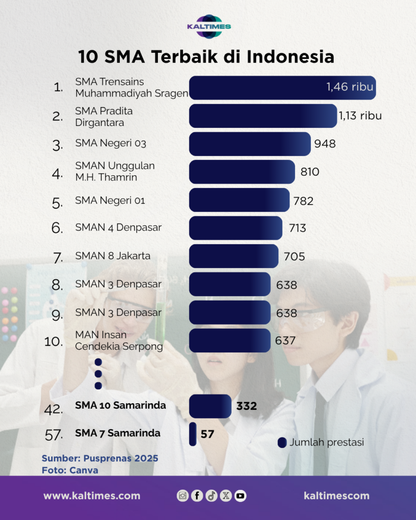 4 sekolah di Kalimantan Timur berhasil menembus peringkat 100 besar nasional versi Puspresnas berkat sistem pembinaan terstruktur dan fasilitas memadai yang berpusat di kota-kota besar seperti Samarinda, Bontang, dan Balikpapan./Istimewa