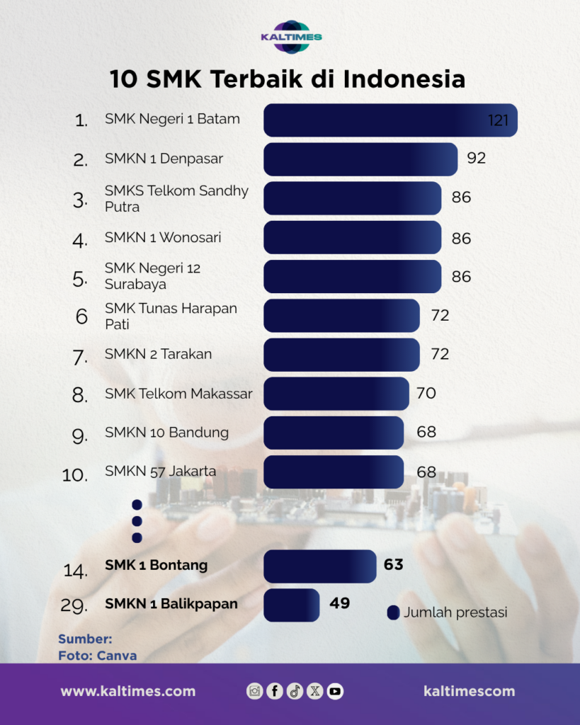 Di kategori SMK, pola serupa terlihat. Tiga besar ditempati SMK Negeri 1 Batam (121 prestasi), SMKN 1 Denpasar (92 prestasi), dan SMKS Telkom Sandhy Putra (86 prestasi).