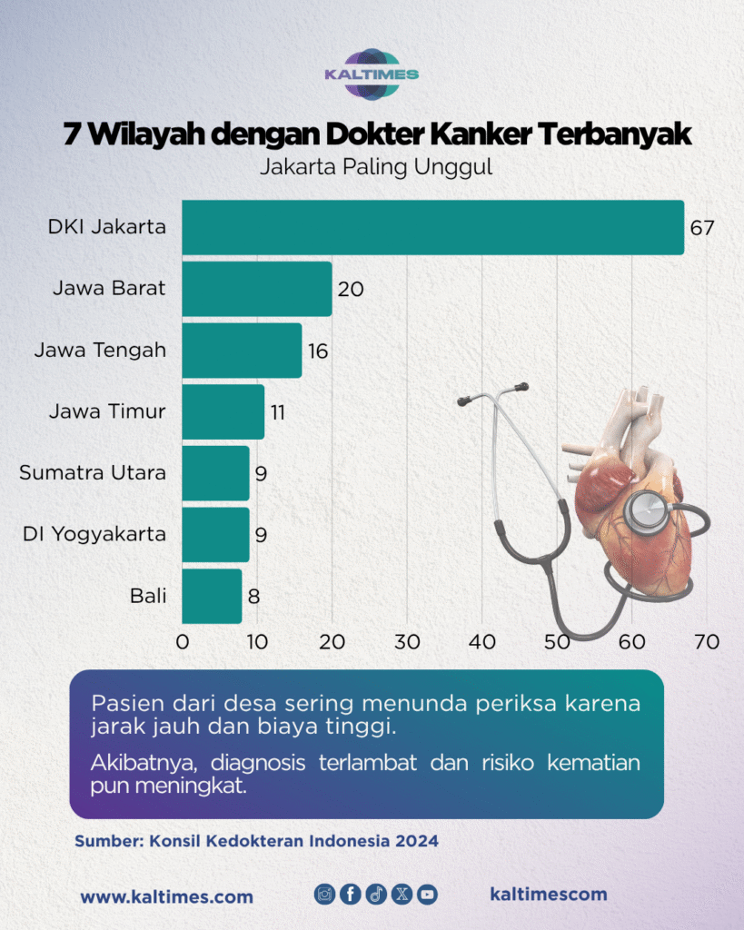 Sayangnya, jumlah dokter spesialis kanker di Indonesia belum cukup. Berdasarkan data Konsil Kedokteran Indonesia, dokter spesialis onkologi masih terkonsentrasi di kota besar. DKI Jakarta memiliki 67 dokter, jauh lebih banyak dibanding provinsi lain. Di bawahnya ada Jawa Barat dengan 20 dokter, lalu Jawa Tengah 16 dokter, Jawa Timur 11 dokter, Sumatra Utara dan Yogyakarta masing-masing 9 dokter, serta Bali 8 dokter.