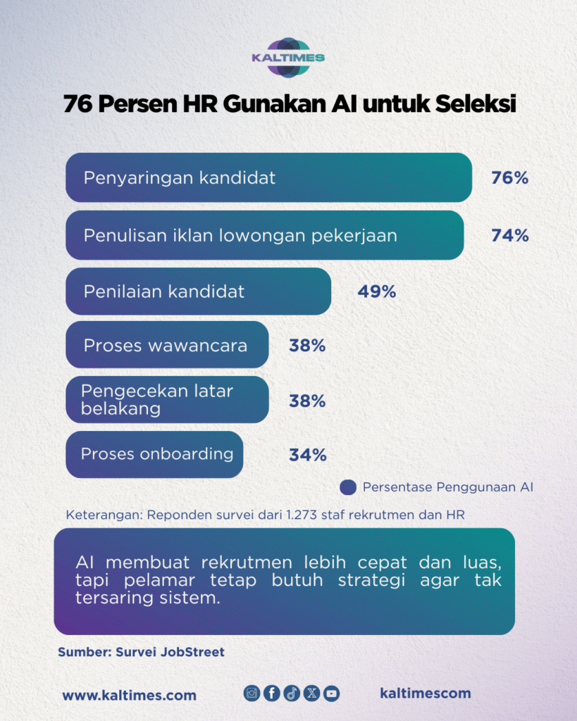 Survei terbaru dari Jobstreet yang melibatkan 1.273 staf rekrutmen dan HR menunjukkan bahwa AI digunakan secara luas dalam proses perekrutan. Sebanyak sekitar 76 persen responden mengatakan AI membantu dalam menyaring kandidat. Sementara itu, 74 persen menggunakannya untuk penulisan iklan lowongan.