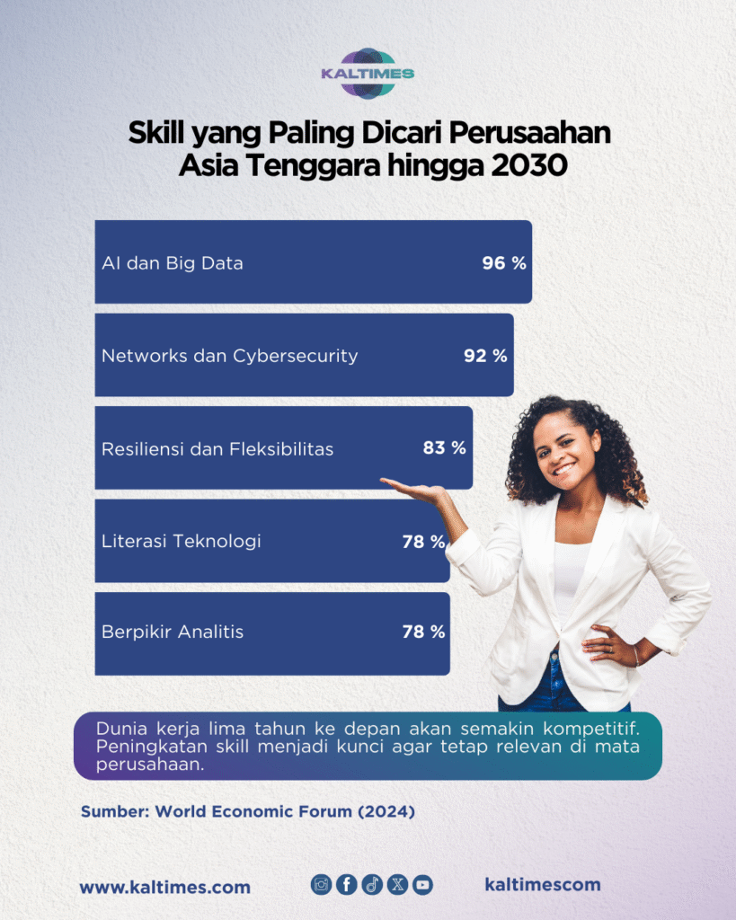 Berdasarkan survei World Economic Forum (WEF) pada 2024 terhadap lebih dari 1.000 perusahaan global, ada lima skill yang akan dominan di Asia Tenggara. Survei ini melibatkan 14,1 juta pekerja dari 22 industri di 55 negara.
