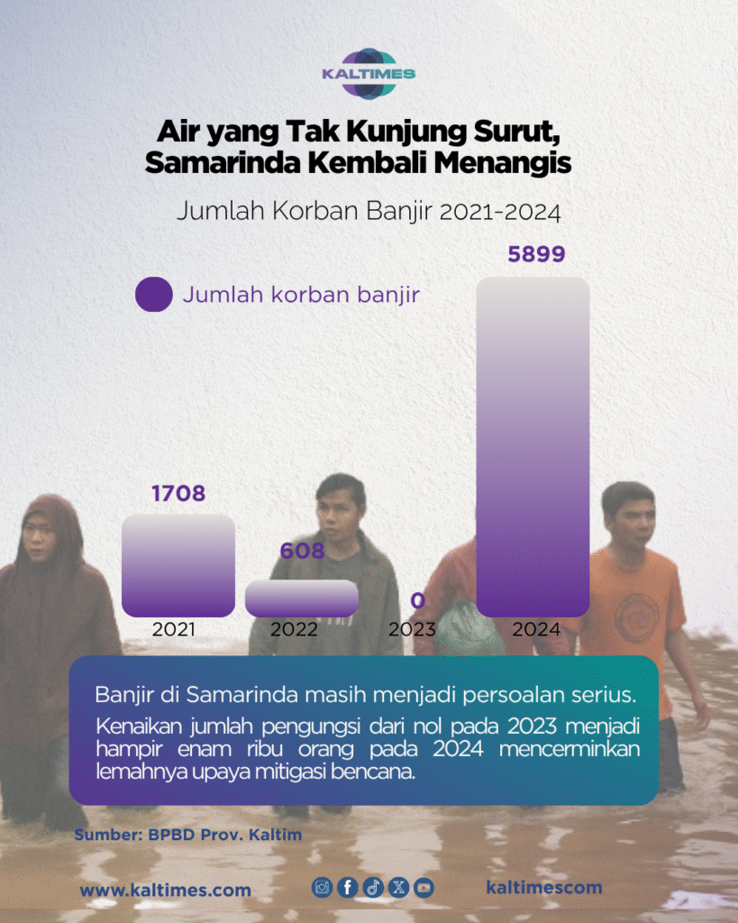 Data dari BPBD menunjukkan bahwa banjir di Samarinda bukan sekadar kejadian musiman tanpa jejak. Selama empat tahun terakhir, jumlah pengungsi akibat banjir naik-turun dengan angka mencolok. Pada 2021 tercatat sebanyak 1.708 orang mengungsi karena banjir.