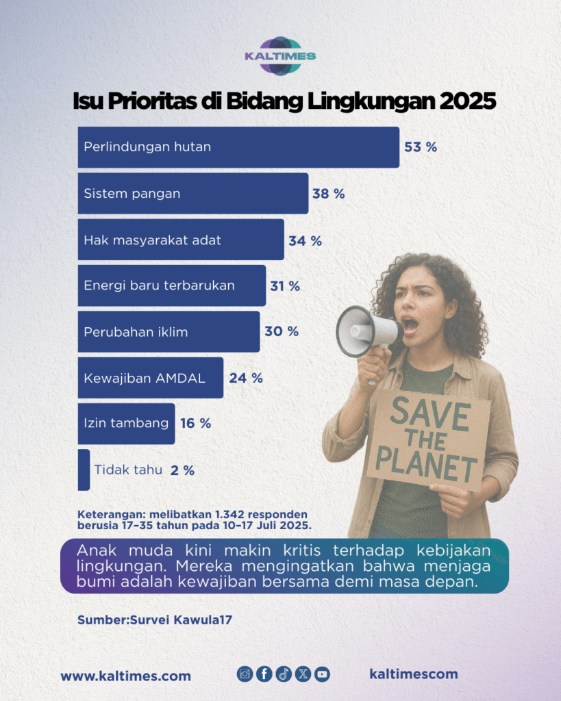 Hasil survei menunjukkan perlindungan hutan menempati urutan pertama dengan 53 persen suara. Laju deforestasi naik dari 230.700 hektare pada 2022 menjadi 257.400 hektare pada 2023. Aktivitas pembukaan lahan pertanian menjadi pemicu utama.