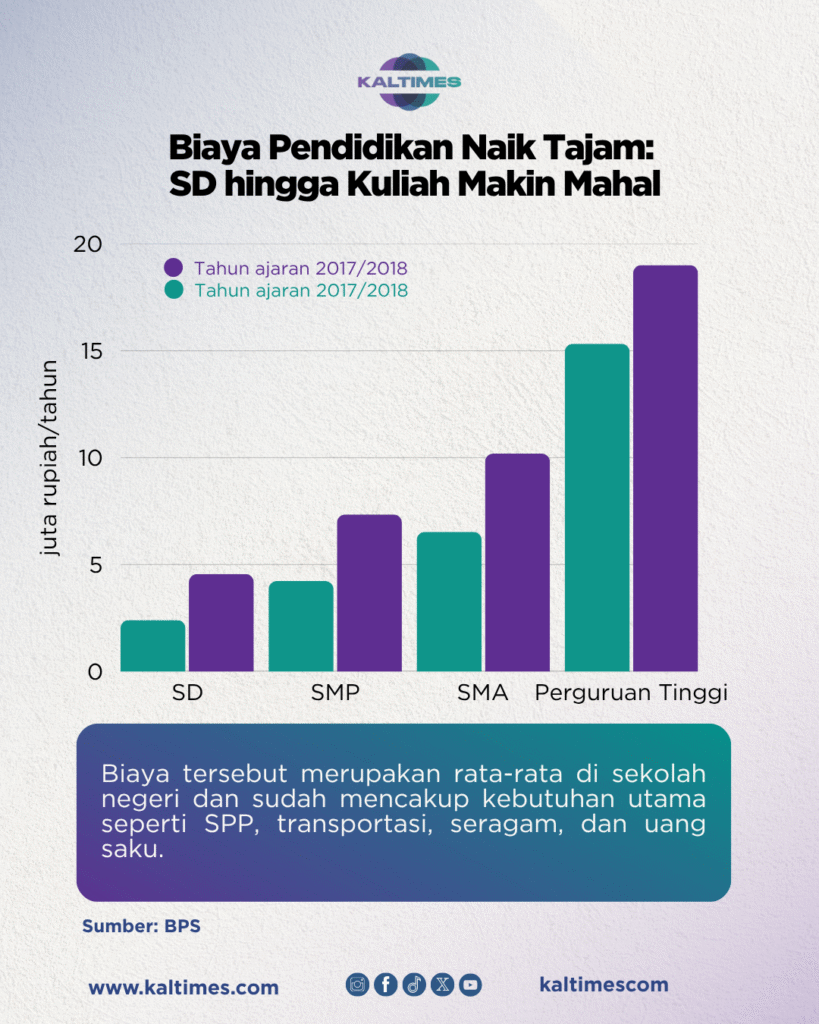 Sementara itu, untuk perguruan tinggi, biaya tahunan kini menyentuh angka Rp 19,01 juta. Nilai ini naik dari Rp 15,33 juta pada 2017/2018. Di tengah harapan agar pendidikan tinggi menjadi pintu mobilitas sosial, kenyataan ini justru menunjukkan bahwa kuliah makin terasa sebagai hak istimewa, bukan hak dasar.