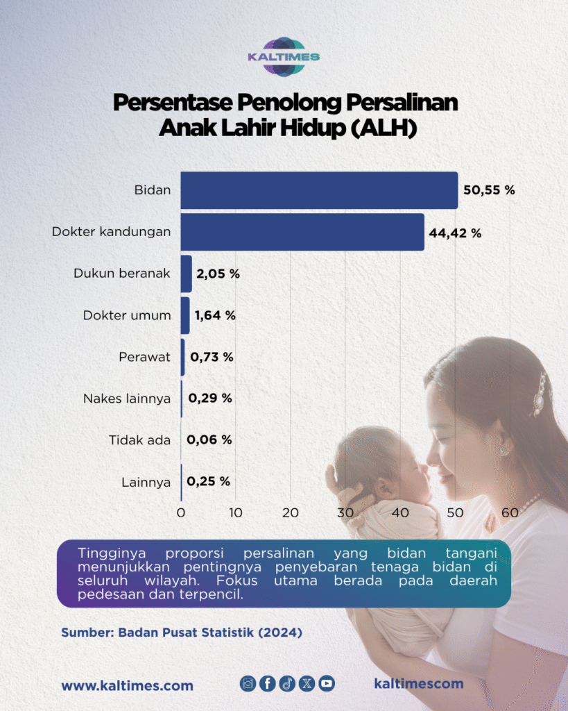 Data Badan Pusat Statistik (BPS) 2025 menunjukkan bidan masih menjadi penopang utama layanan kesehatan ibu dan anak di tanah air. Sebanyak 50,55 persen ibu Indonesia menjadikan bidan sebagai penolong utamanya ketika melahirkan ALH.