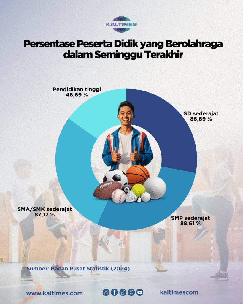 Berdasarkan data Badan Pusat Statistik (BPS) 2024, mayoritas pelajar tercatat aktif berolahraga. Namun, angka ini menurun drastis ketika peserta didik masuk jenjang pendidikan tinggi. Ini menandakan perubahan gaya hidup signifikan.