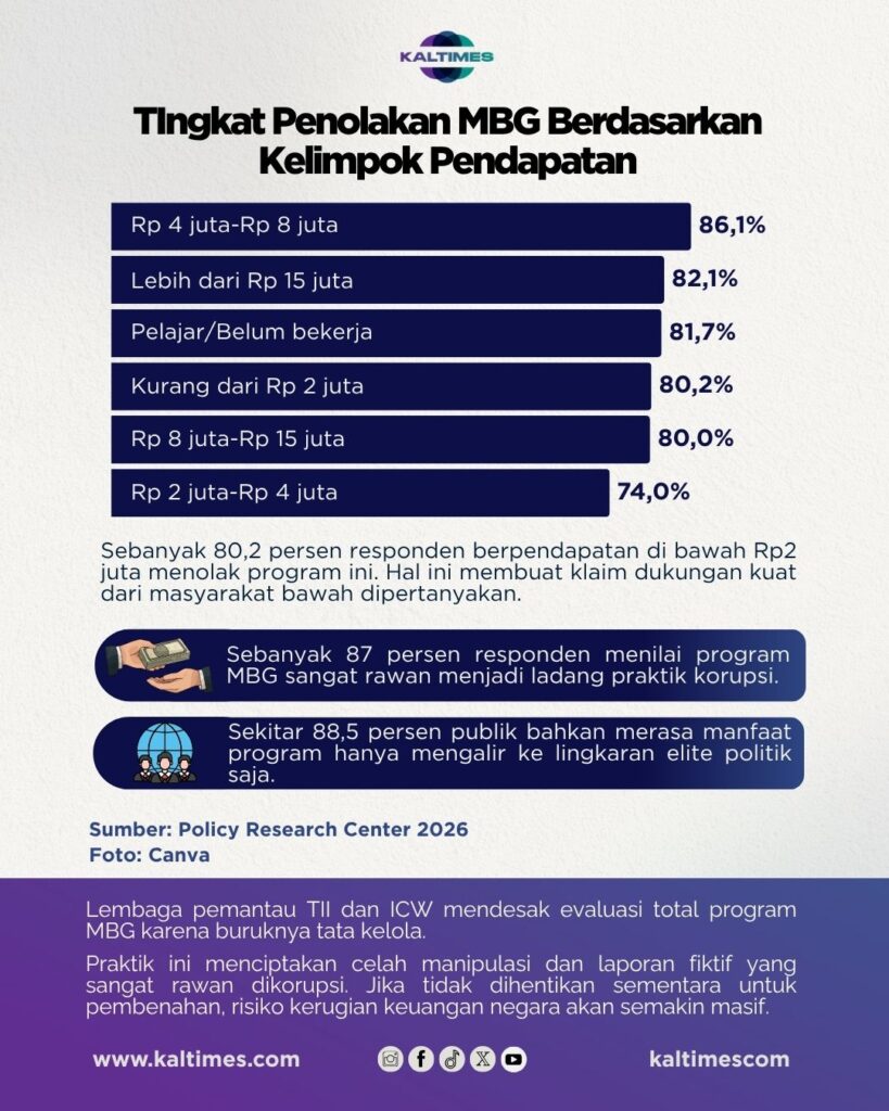 Selain masalah kualitas, publik sangat khawatir terhadap potensi penyelewengan dana anggaran yang sangat besar. Sebanyak 87 persen responden menilai program MBG sangat rawan menjadi ladang praktik korupsi. Sekitar 88,5 persen publik bahkan merasa manfaat program hanya mengalir ke lingkaran elite politik saja.