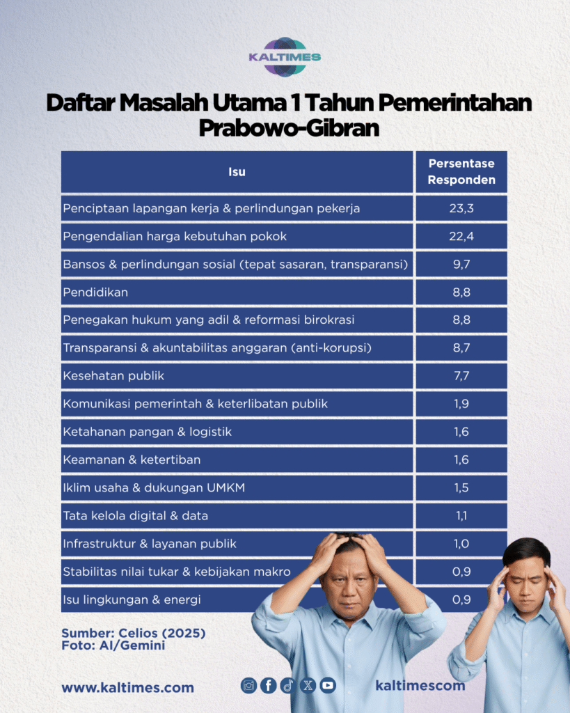 Laporan CELIOS mengungkapkan isu utama yang diharapkan segera diurus pemerintah. Isu utama tersebut adalah penciptaan lapangan kerja dan perlindungan kerja. Persentasenya mencapai 23,3 persen. Hal ini menunjukkan kesulitan masyarakat mencari pekerjaan yang layak masih menjadi masalah nomor satu.