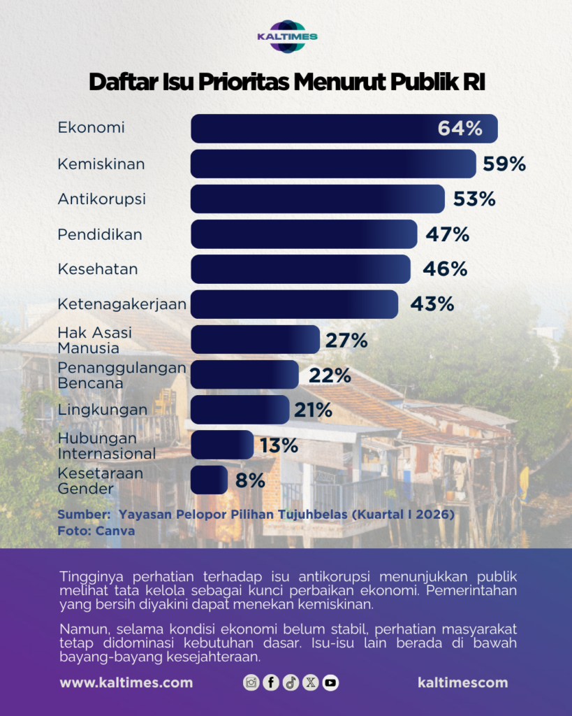 Sejalan dengan kondisi di lapangan, hasil survei menempatkan isu ekonomi sebagai prioritas utama publik dengan persentase 64 persen. Tidak jauh berbeda, isu kemiskinan berada di posisi kedua dengan angka 59 persen, memperkuat gambaran bahwa persoalan kesejahteraan masih menjadi fokus utama masyarakat.