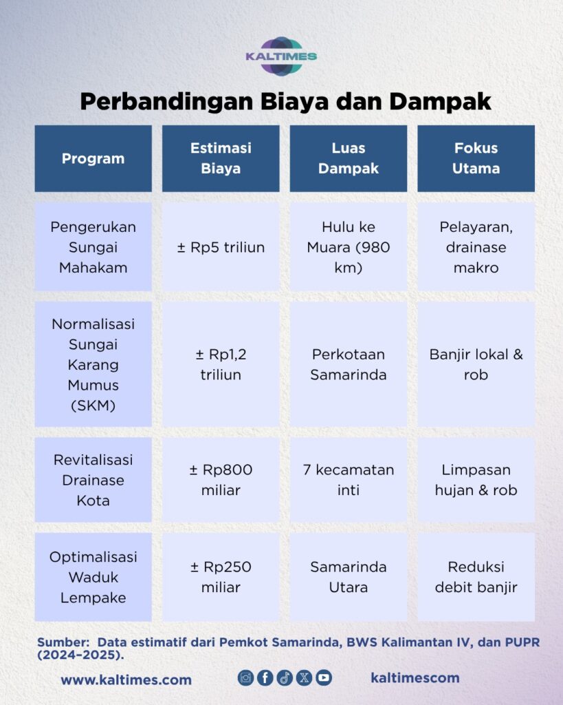 Jika proyek dikerjakan secara bertahap, tahap awal (sekitar 100 km dari muara hingga pusat kota Samarinda) diperkirakan memerlukan Rp1 triliun–Rp1,5 triliun. Selain mengurangi risiko banjir, proyek ini juga berpotensi meningkatkan kapasitas pelayaran hingga 60%, terutama bagi sektor batubara dan logistik pelabuhan.