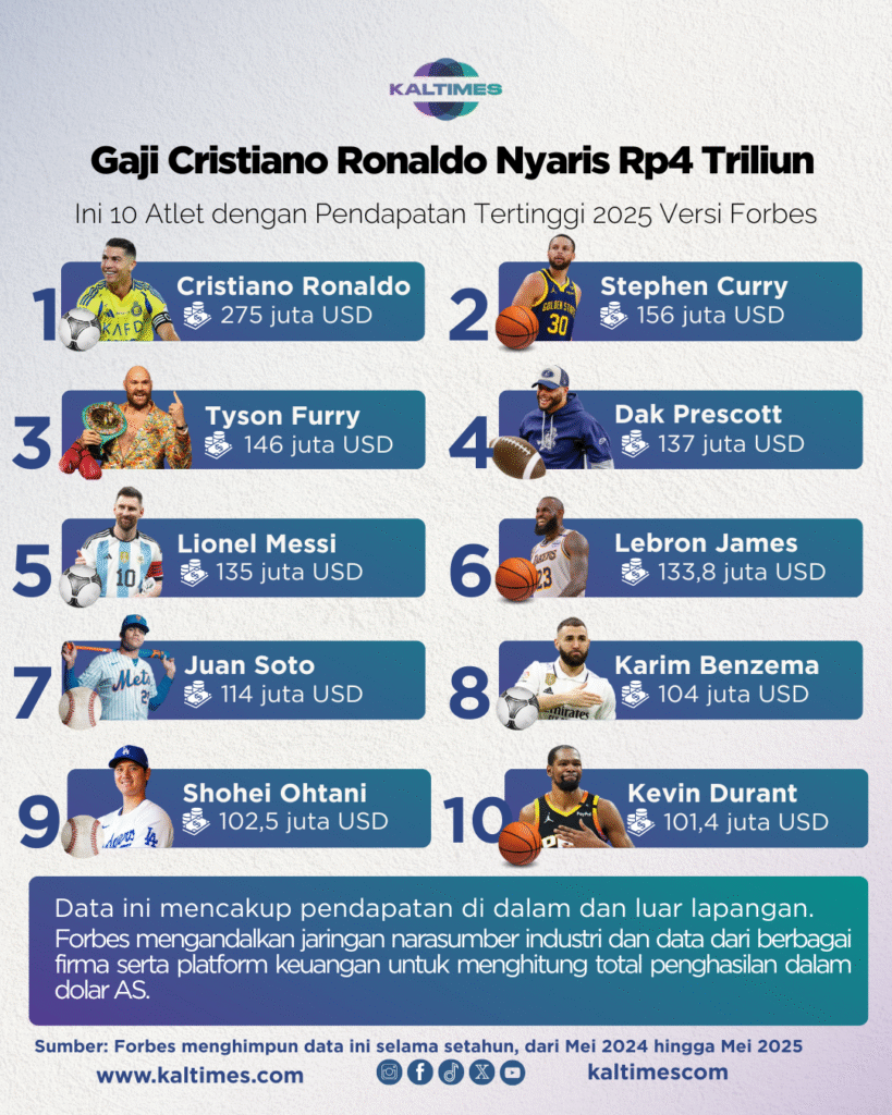 Di posisi teratas, megabintang sepak bola asal Portugal Cristiano Ronaldo mencetak rekor luar biasa dengan pendapatan mencapai 275 juta dolar AS. Angka ini didorong oleh kontrak besar bersama klub Al-Nassr di Arab Saudi dan portofolio sponsor global seperti Nike, Binance dan Herbalife.