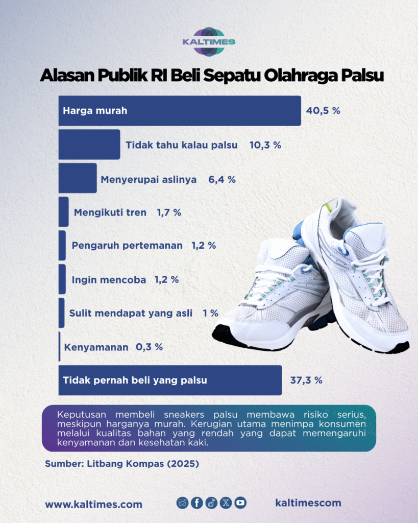 Faktanya, lebih dari setengah publik memilih membeli sneakers palsu, menurut survei Litbang Kompas. Untuk mendapatkan data ini, Litbang Kompas mewawancarai 512 responden dari 64 kota di 38 provinsi Indonesia. Mereka melaksanakan survei ini pada 14-17 Juli 2025.