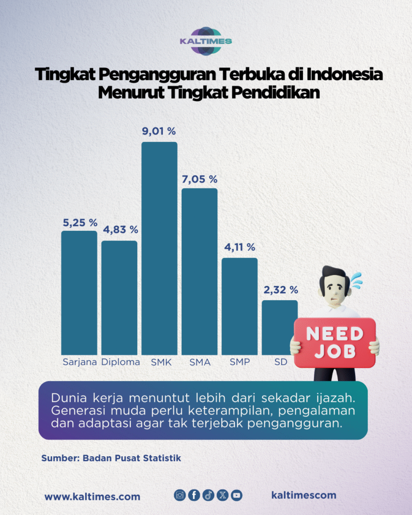 Data terbaru Badan Pusat Statistik (BPS) melalui Survei Angkatan Kerja Nasional 2024 mencatat Tingkat Pengangguran Terbuka (TPT) tertinggi berasal dari lulusan SMK. Sebanyak 9,01 persen lulusan masih mencari pekerjaan aktif. Padahal, pemerintah merancang pendidikan SMK agar siswanya siap masuk dunia kerja.