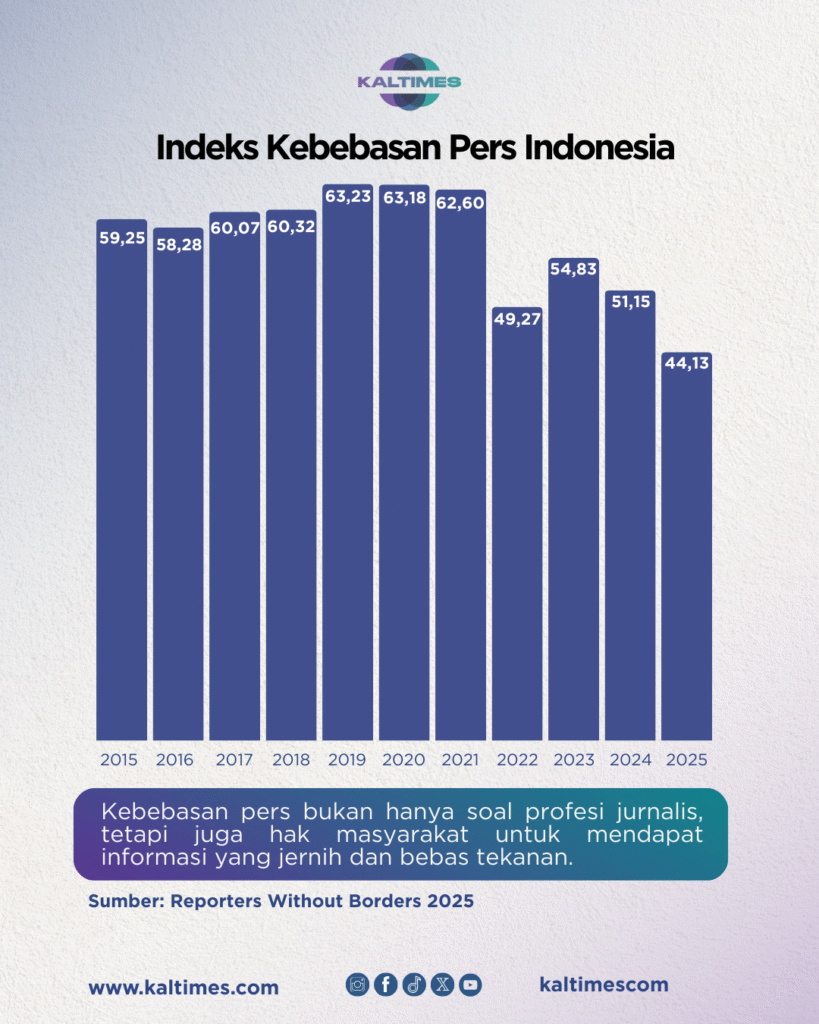 Reporters Without Borders (RSF) 2025 mencatat penurunan tajam indeks kebebasan pers Indonesia dalam lima tahun terakhir. Indeks ini diukur melalui survei jurnalis di 180 negara, dengan kategori penilaian meliputi politik, hukum, ekonomi, sosial budaya, dan keselamatan.