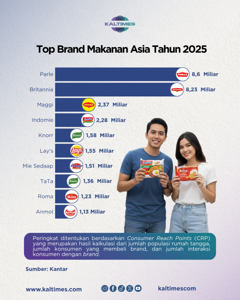 Kantar merilis Brand Footprint Asia 2025, laporan tahunan yang menggambarkan kekuatan industri FMCG (Fast-Moving Consumer Goods) di kawasan. Laporan ini menilai brand dengan tolok ukur Consumer Reach Points (CRP). Nilai ini gabungan dari jumlah rumah tangga, konsumen yang membeli, dan frekuensi interaksi konsumen dengan produk.
