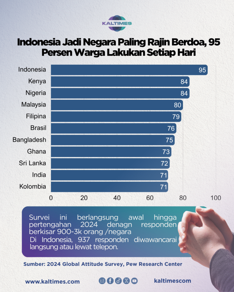 Hasilnya, Indonesia tercatat sebagai negara paling rajin berdoa di dunia. Sebanyak 95 persen responden di Indonesia mengaku berdoa minimal sekali sehari. Hanya 5 persen yang mengaku berdoa sesekali saja.