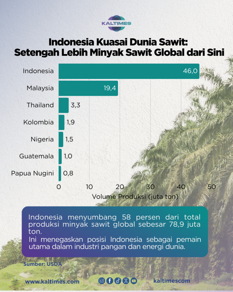 Dari total produksi global 78,9 juta ton, Indonesia menyumbang 58 persen. Artinya, lebih dari separuh pasokan minyak sawit dunia berasal dari tanah air. Dominasi ini menunjukkan peran besar Indonesia dalam industri pangan dan energi dunia.