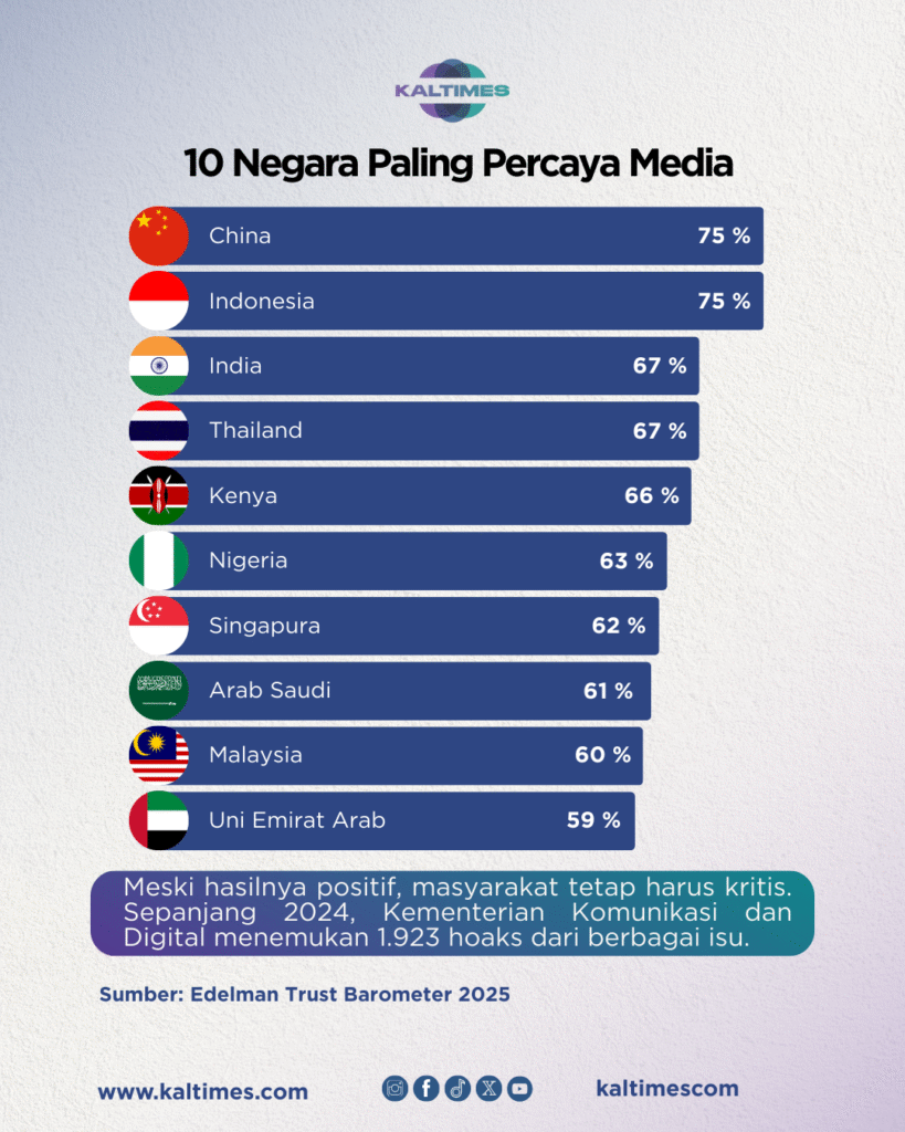 Edelman Trust Barometer 2025 mencatat Indonesia berhasil masuk jajaran negara dengan tingkat kepercayaan tertinggi terhadap media. Survei ini melibatkan lebih dari 33.000 responden dari 28 negara, dengan rata-rata 1.150 orang perwakilan, pada 25 Oktober–16 November 2024.