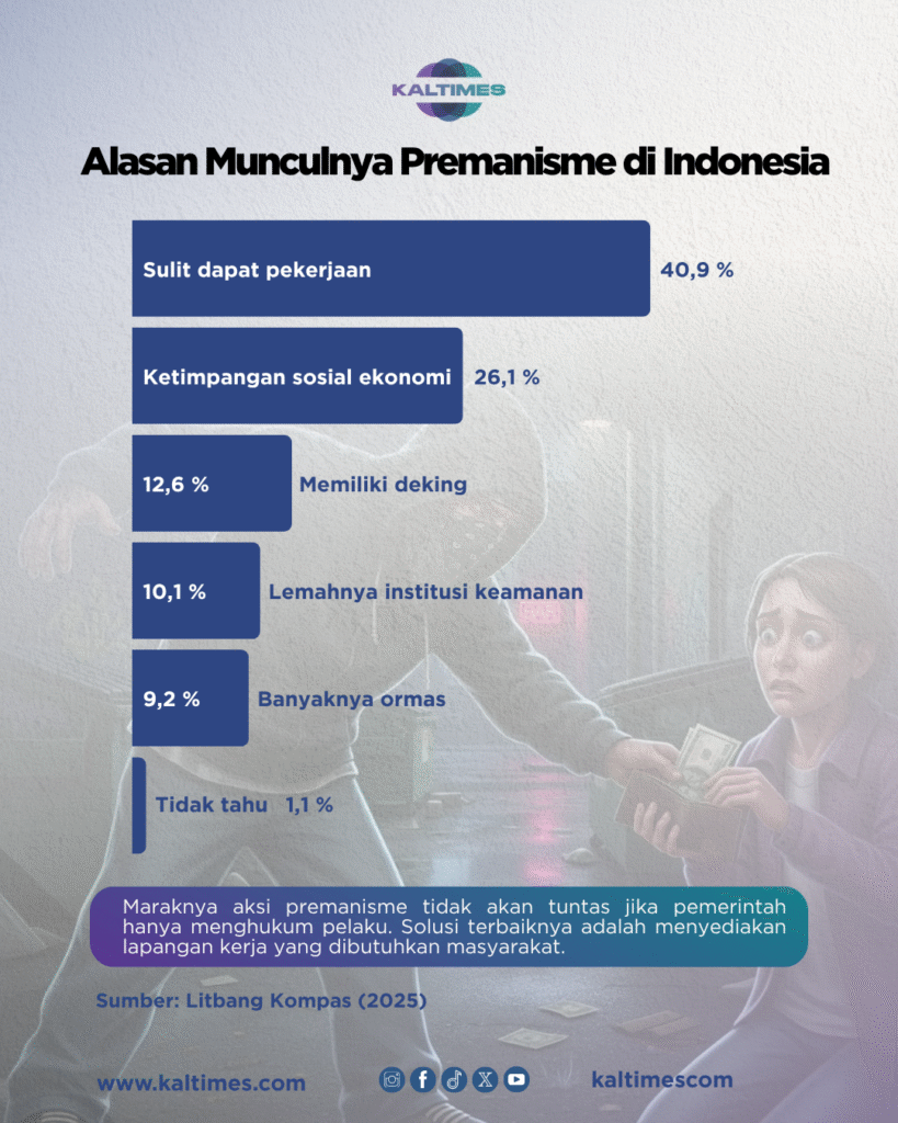 Berdasarkan hasil survei Litbang Kompas, isu pengangguran terbukti menjadi faktor utama yang melatarbelakangi aksi premanisme di Indonesia. Litbang Kompas mengumpulkan data ini melalui wawancara terhadap 514 responden dari 58 kota di 38 provinsi pada 19-22 Mei 2025.