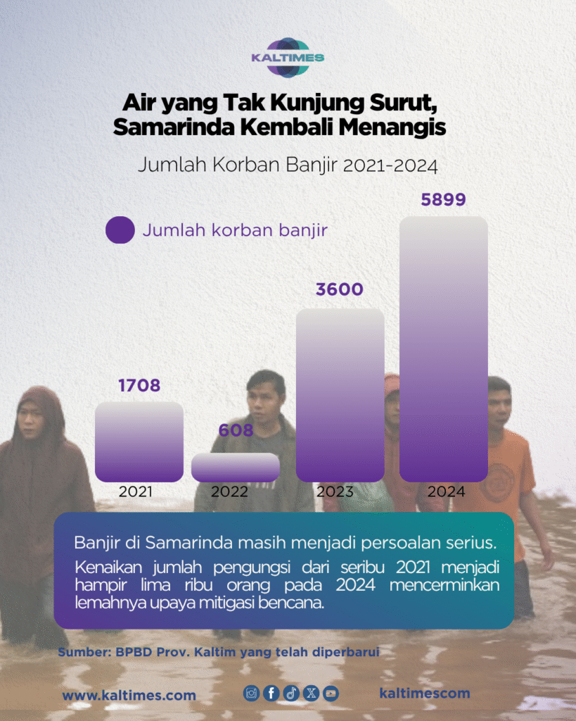 Untungnya pada tahun 2022 angka ini menurun menjadi 608 jiwa. Namun, pada 2023, banjir kembali meluas dengan jumlah korban mencapai 3.600 jiwa. Tahun 2024 menjadi yang paling berat, di mana korban terdampak membengkak hingga 5.899 jiwa. Data ini menunjukkan bahwa meski upaya penanganan terus berjalan, intensitas dan dampak banjir masih menjadi tantangan besar bagi kota ini.