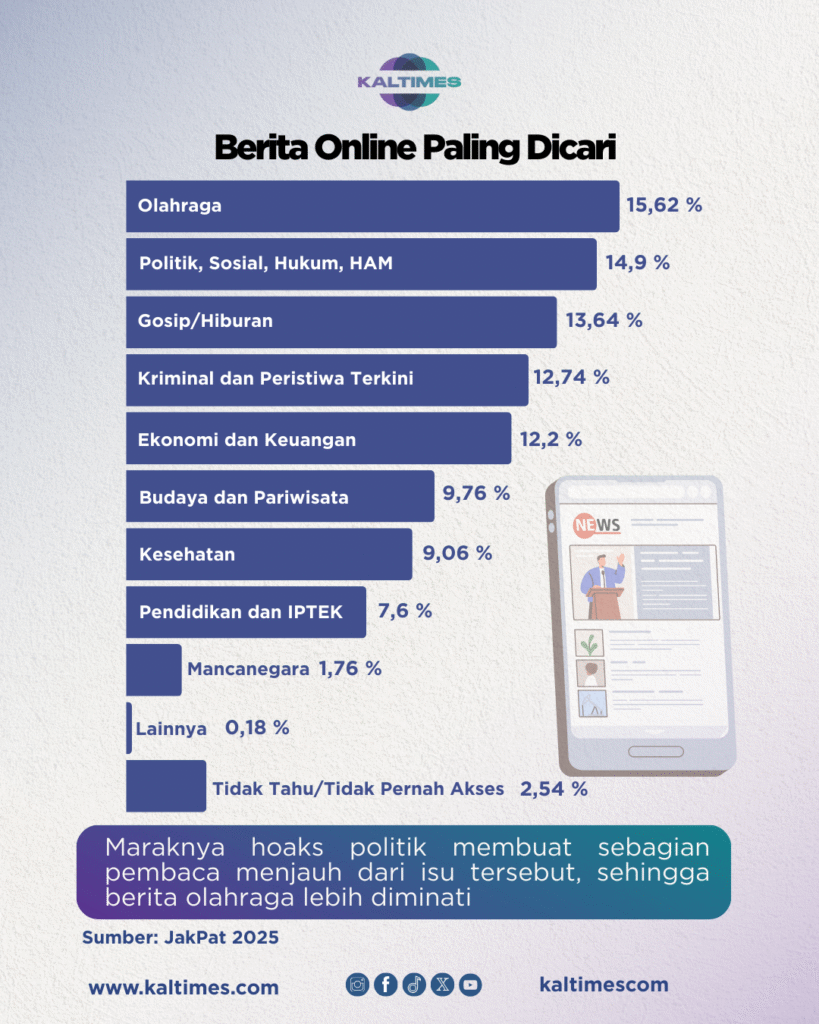 Publik menempatkan berita politik, sosial, hukum, dan HAM di posisi kedua dengan 14,9 persen, turun dari 19,18 persen pada 2024. Konten hoaks politik yang marak diyakini membuat sebagian pembaca menjauh dari isu tersebut.