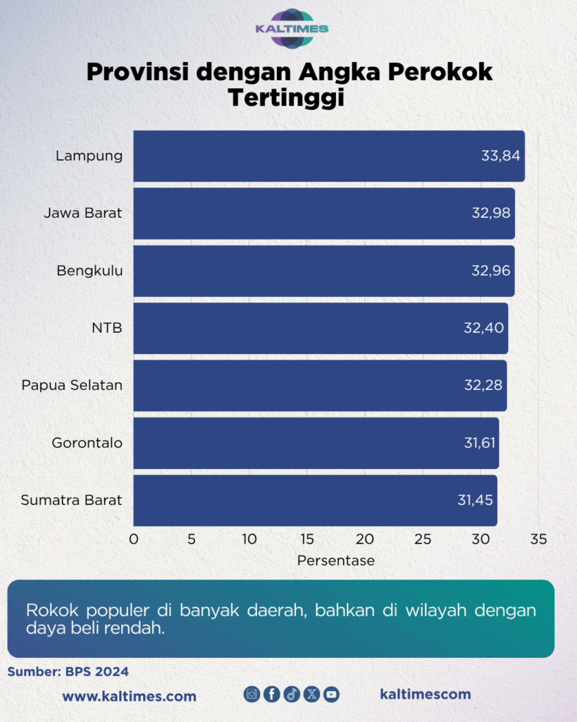 Berdasarkan data BPS 2024, Lampung menjadi provinsi dengan perokok terbanyak. Sebanyak 33,84 persen penduduk usia 15 tahun ke atas di sana merokok dalam sebulan terakhir. Jawa Barat menempati posisi kedua dengan 32,98 persen. Bengkulu berada di peringkat ketiga dengan 32,96 persen. Disusul Nusa Tenggara Barat, Kalimantan Barat, Gorontalo, dan Sumatera Selatan yang juga mencatat angka di atas 30 persen.