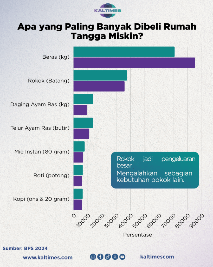 Beras ada di urutan pertama kebutuhan makanan. Di perkotaan, rata-rata pengeluaran mencapai Rp71.031 per kg per kapita per bulan. Di pedesaan, Rp85.404. Rokok berada di urutan kedua. Rata-rata pengeluaran di perkotaan Rp37.590 per batang per kapita per bulan. Di pedesaan, Rp35.888.