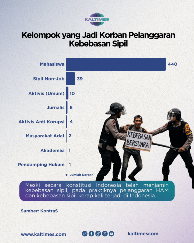 Meski konstitusi menjamin kebebasan sipil, faktanya pelanggaran terus terjadi. Berdasarkan Pemantauan Situasi Kebebasan Sipil di Indonesia Semester 1 2025 yang dirilis oleh Komisi Untuk Orang Hilang dan Korban Tindak Kekerasan (KontraS), pada semester I 2025 terdapat 503 korban pelanggaran kebebasan sipil.