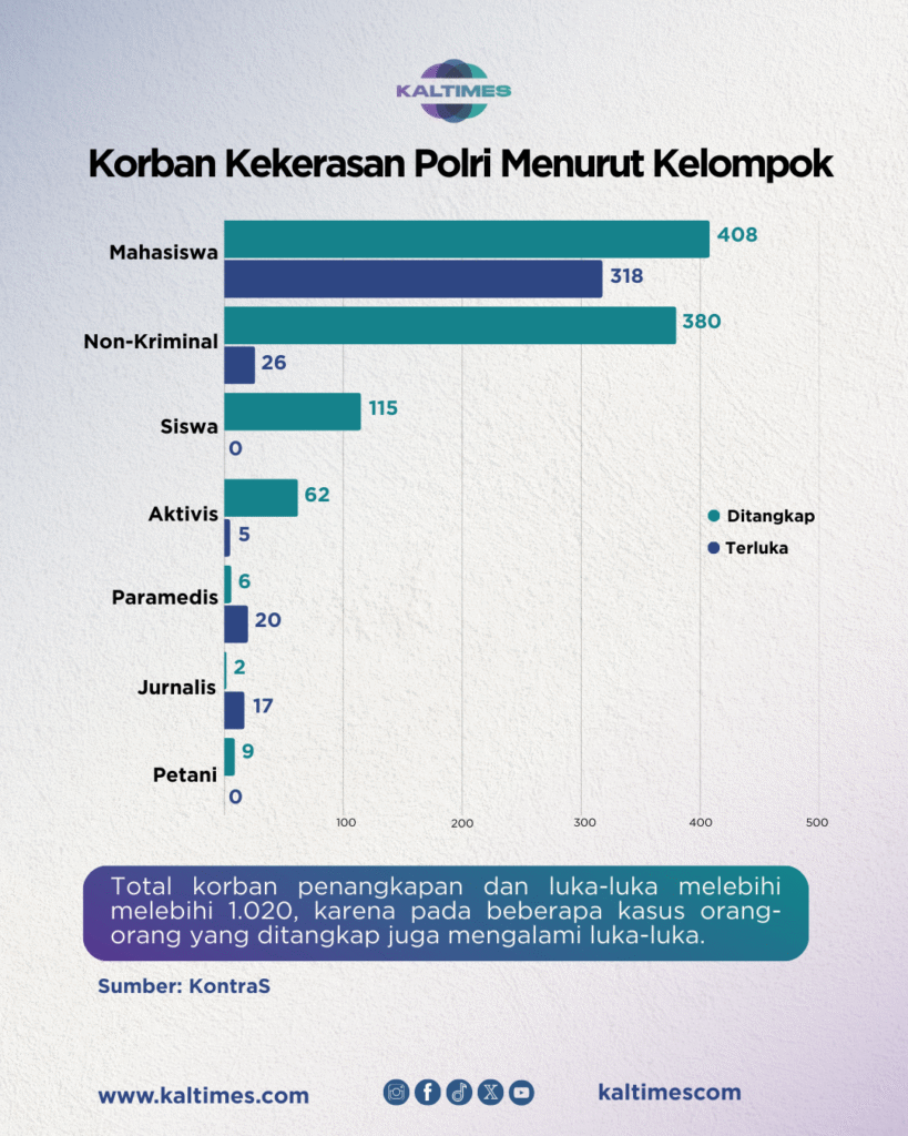 KontraS juga mencatat sebanyak 1.020 orang menjadi korban kekerasan Polri sepanjang Juli 2024–Juni 2025. Dari jumlah itu, 408 mahasiswa ditangkap dan 318 mengalami luka. Warga sipil non-kriminal juga terdampak, dengan 380 orang ditangkap tanpa prosedur hukum dan 26 orang terluka.