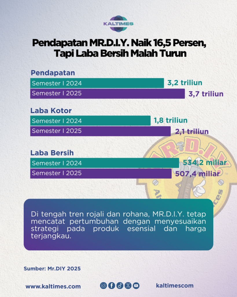 PT Duta Intiguna Yasa Tbk (MDIY), pemilik jaringan MR.D.I.Y., membukukan pendapatan Rp 3,7 triliun sepanjang Semester I 2025. Angka ini naik 16,5 persen dibanding periode sama tahun lalu. Laba kotor juga tumbuh 19 persen menjadi Rp 2,1 triliun.