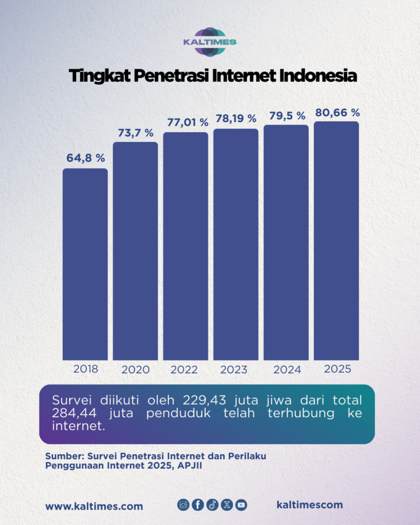 Tingkat penetrasi internet di Indonesia terus menunjukkan tren positif dalam beberapa tahun terakhir. Berdasarkan laporan Asosiasi Penyelenggara Jasa Internet Indonesia (APJII) melalui Survei Penetrasi Internet dan Perilaku Penggunaan Internet 2025, sebanyak 229,43 juta jiwa dari total 284,44 juta penduduk telah terhubung ke internet. Angka ini setara dengan 80,66 persen populasi.