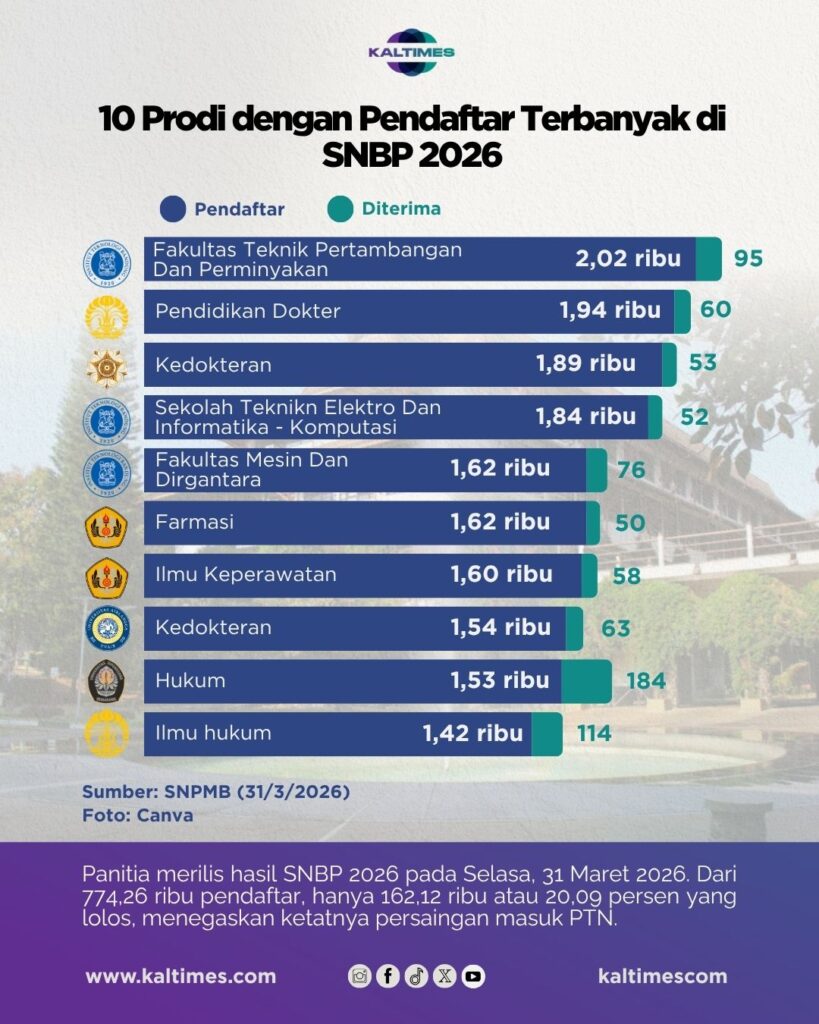 Ketatnya persaingan tersebut tercermin dari konsentrasi pilihan pada program studi tertentu. Data siaran langsung SNPMB ID (31/3/2026), menunjukkan lonjakan peminat pada Fakultas Teknik Pertambangan dan Perminyakan (FTTM) di Institut Teknologi Bandung. Jurusan ini mencapai 2,02 ribu pendaftar, sementara daya tampungnya hanya 95 kursi.
