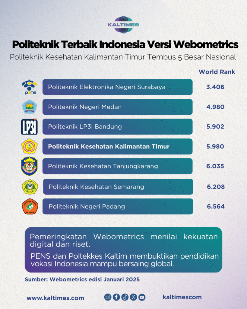 Dari daftar ini, Politeknik Kesehatan Kalimantan Timur (Poltekkes Kaltim) patut dibanggakan. Sebagai satu-satunya politeknik kesehatan yang konsisten masuk jajaran elit, Poltekkes Kaltim menonjol di bidang kesehatan vokasi. Keberhasilan ini didorong oleh kualitas pengajaran keperawatan, kebidanan, dan kesehatan masyarakat yang relevan kebutuhan industri kesehatan lokal. Digitalisasi kampus, publikasi ilmiah, dan kolaborasi dengan fasilitas layanan kesehatan turut memperkuat posisi Poltekkes Kaltim di panggung global.