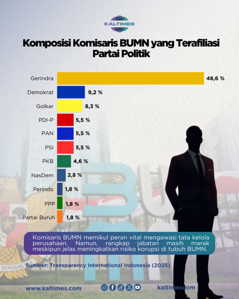 TII menemukan 165 dari 562 komisaris BUMN merupakan politisi. Sebanyak 104 komisaris merangkap menjadi kader partai politik. Sementara itu, 61 komisaris lainnya adalah relawan politik yang mendukung kampanye tertentu.