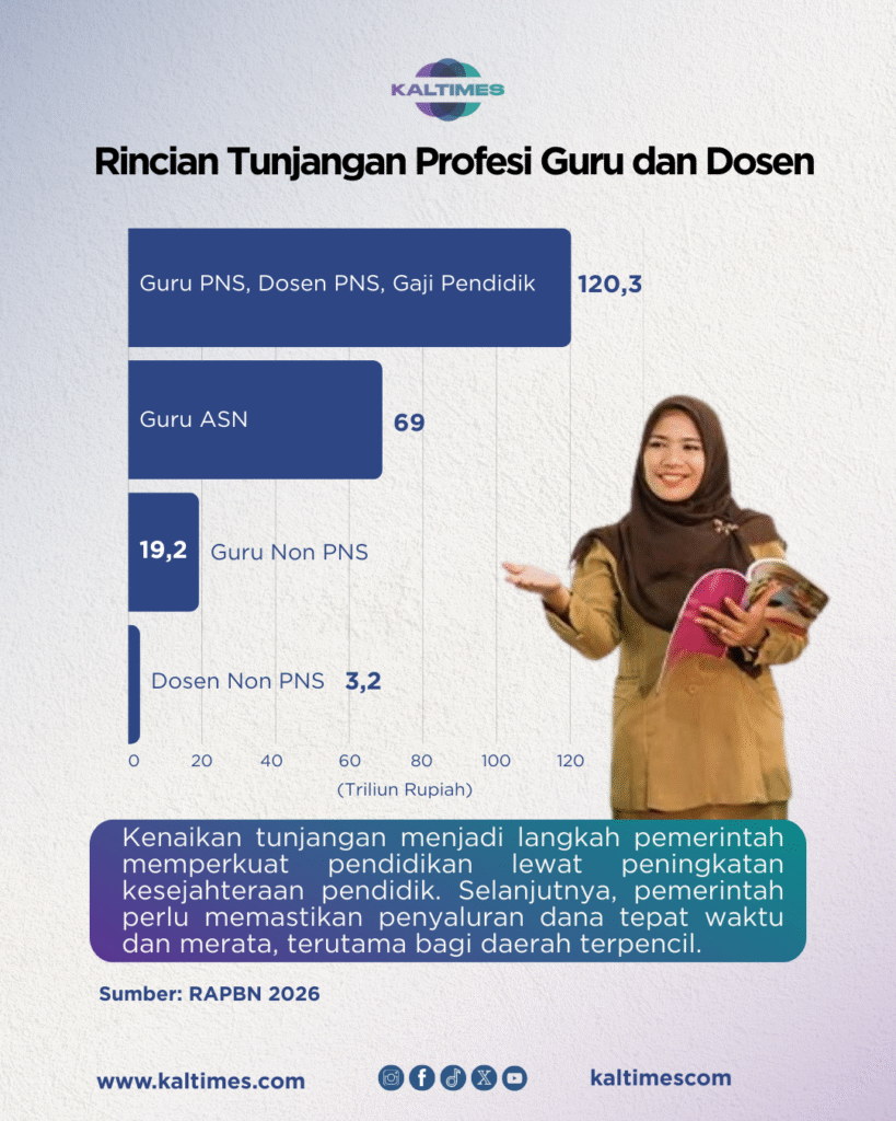 Porsi terbesar justru mengalir kepada guru dan dosen PNS serta gaji pendidik. Pemerintah menetapkan anggaran Rp120,3 triliun untuk pos ini, sehingga jumlahnya mendominasi total belanja tunjangan pendidikan dalam RAPBN 2026.