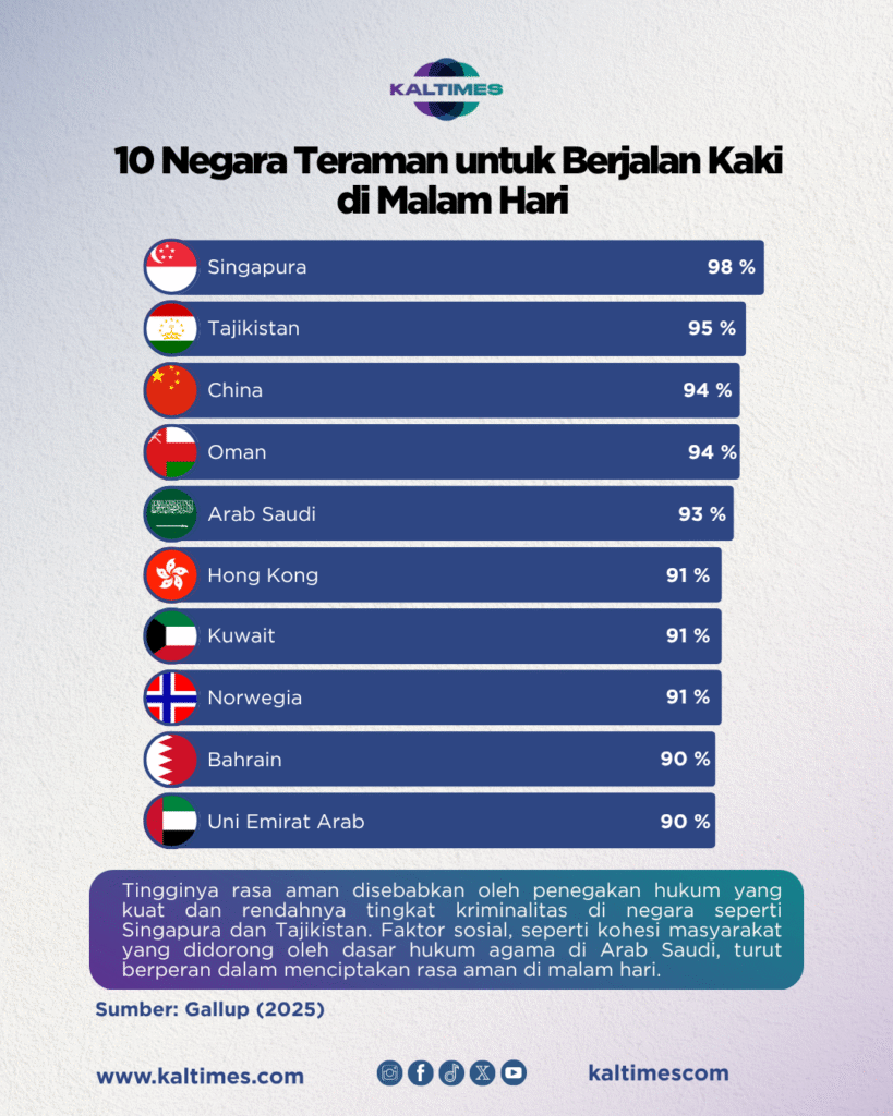 Malam hari sering kali dianggap waktu yang berbahaya karena rentan terjadi tindak kejahatan. Tetapi, ternyata beberapa negara justru memiliki tingkat keamanan yang sangat baik bahkan ketika malam hari. Survei dari Gallup (2025), terdapat sepuluh negara yang paling aman untuk berjalan kaki di malam hari. Gallup menentukan negara-negara ini berdasarkan survei kepada 1.000 responden di 144 negara dan wilayah pada tahun 2024.