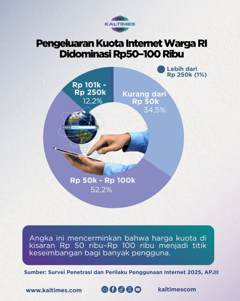 Mayoritas masyarakat, yakni 52,27 persen, mengalokasikan Rp 50 ribu hingga Rp 100 ribu per bulan untuk kuota internet. Sebanyak 34,52 persen hanya menghabiskan kurang dari Rp 50 ribu. Kelompok yang mengeluarkan Rp 101 ribu–Rp 250 ribu per bulan mencapai 12,2 persen, sementara yang di atas Rp 250 ribu sangat sedikit, hanya 1,02 persen.