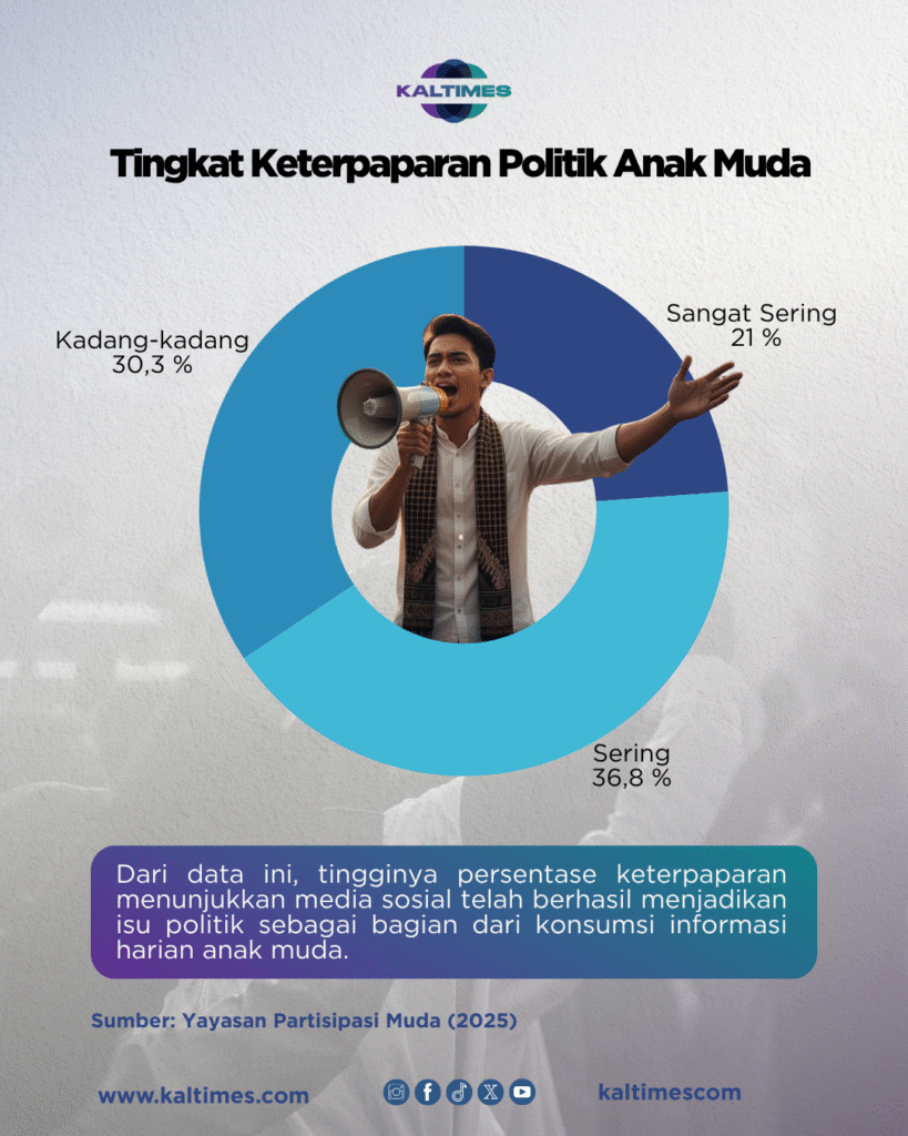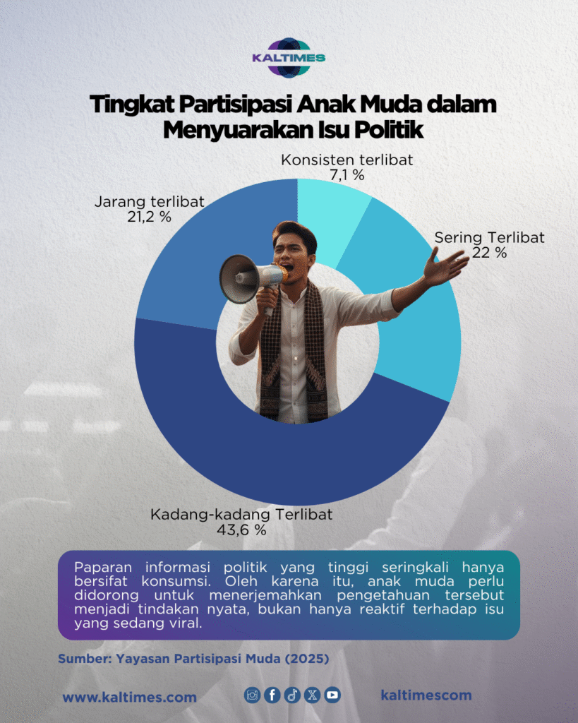 Ada korelasi signifikan antara tingkat keterpaparan dan partisipasi. 57,8 persen anak muda sering terpapar informasi politik. Namun, hanya 29,1 persen (7,1 persen aktif dan 22 persen sering) yang aktif menyuarakan isu. Sisanya, 43,6 persen yang kadang-kadang terlibat, mencerminkan adanya gap antara sekadar tahu dan bertindak.