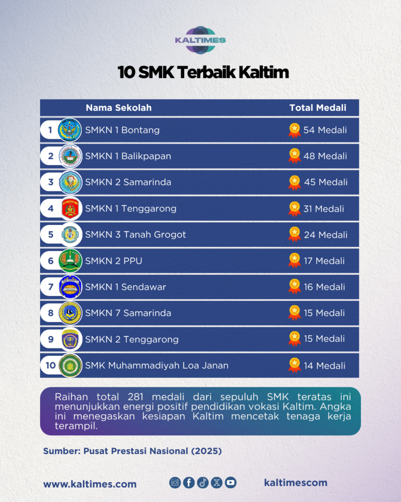Faktanya, data Pusat Prestasi Nasional (Puspresnas) menunjukkan bahwa ada sepuluh SMK yang paling dominan mengumpulkan medali di Kalimantan Timur. Berdasarkan data tersebut, SMKN 1 Bontang menduduki peringkat pertama dengan total 54 medali. Peringkat kedua ditempati SMKN 1 Balikpapan yang mengantongi 48 medali. Sementara itu, SMKN 2 Samarinda melengkapi tiga besar dengan total 45 medali.