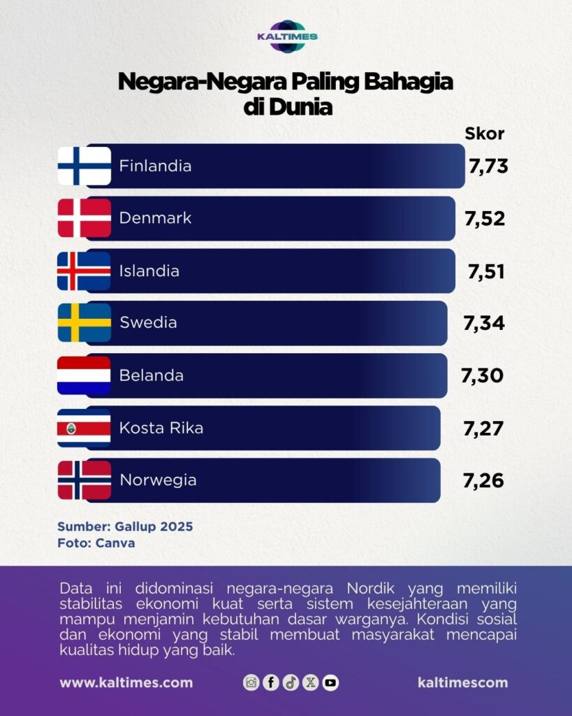 Finlandia meraih skor tertinggi sebesar 7,736 poin, disusul oleh Denmark dengan skor 7,521 dan Islandia 7,515 poin. Swedia menutup posisi empat besar dengan skor 7,345 poin berdasarkan data rata-rata dari 2023 hingga 2025.