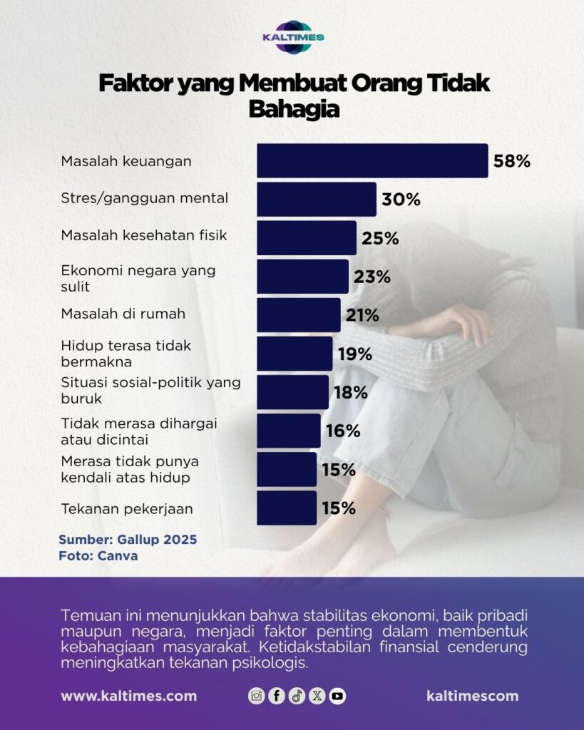 Berdasarkan hasil survei tersebut, penyebab hilangnya kebahagiaan paling dominan adalah masalah keuangan pribadi. Sebanyak 58 persen responden menyebut kondisi finansial yang buruk sebagai sumber utama rasa sedih dan cemas.