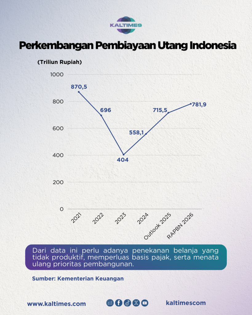 Kenaikan pembiayaan utang memberi sinyal tantangan serius bagi fiskal. Pemerintah kini tampak mengandalkan pola “gali lubang, tutup lubang”, yakni memakai pinjaman baru untuk membayar utang lama. Akibatnya, rasio utang terus naik dan berisiko menekan ruang belanja produktif.